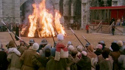 Jeanne d‘Arc uitvoerig in beeld gebracht. Bij onze zuiderburen is ze niet minder dan een nationale held en staat ze symbool voor de moed van de Fransen in slechte tijden. Het hoeft dan ook niet te verbazen dat haar biografie telkens opnieuw verteld wordt, want haar moed, haar onwankelbare geloof en de feministische trekjes in haar karakter spreken jonge generaties elke keer opnieuw aan. A2 en La Sept sloegen in 1989 de handen in elkaar en kwam voor de pinnen met een uitgebreide tv-serie waarin Jeanne D’Arc centraal staat. De film neemt een trage start in haar geboortedorp Vaucouleurs in Lotharingen en meandert vervolgens langzaam via de intriges aan het plaatselijke hof én aan het hof van Karel VII, naar een eerste hoogtepunt, nl. de belegering van Orléans. Alle politieke en persoonlijke intriges die belangrijk zijn voor een goed begrip komen aan bod, maar dat gaat ten koste van de voortgang (vooral in aflevering 1), terwijl een niet-Frans publiek veeleer de militaire carrière van Jeanne D’Arc als echte leidraad wil zien. Tussen haakjes: de politieke context is een zodanig kluwen, dat het voor niet-ingewijden zeer moeilijk is om een overzicht te krijgen en te behouden inzake de verschillende betrokken partijen en hun belangen, maar dat is niet nodig met een sterk hoofdpersonage en voldoende avontuur.